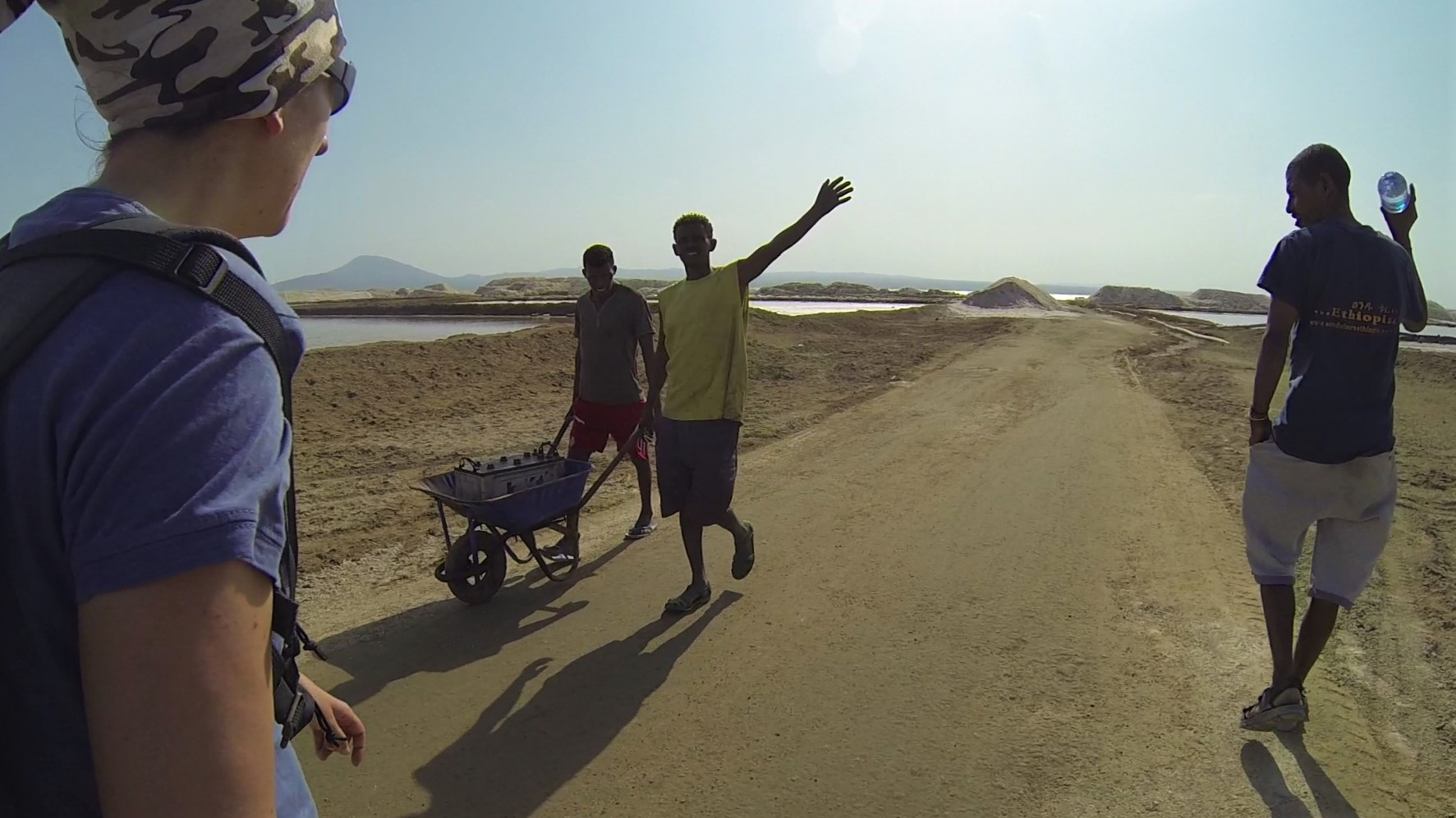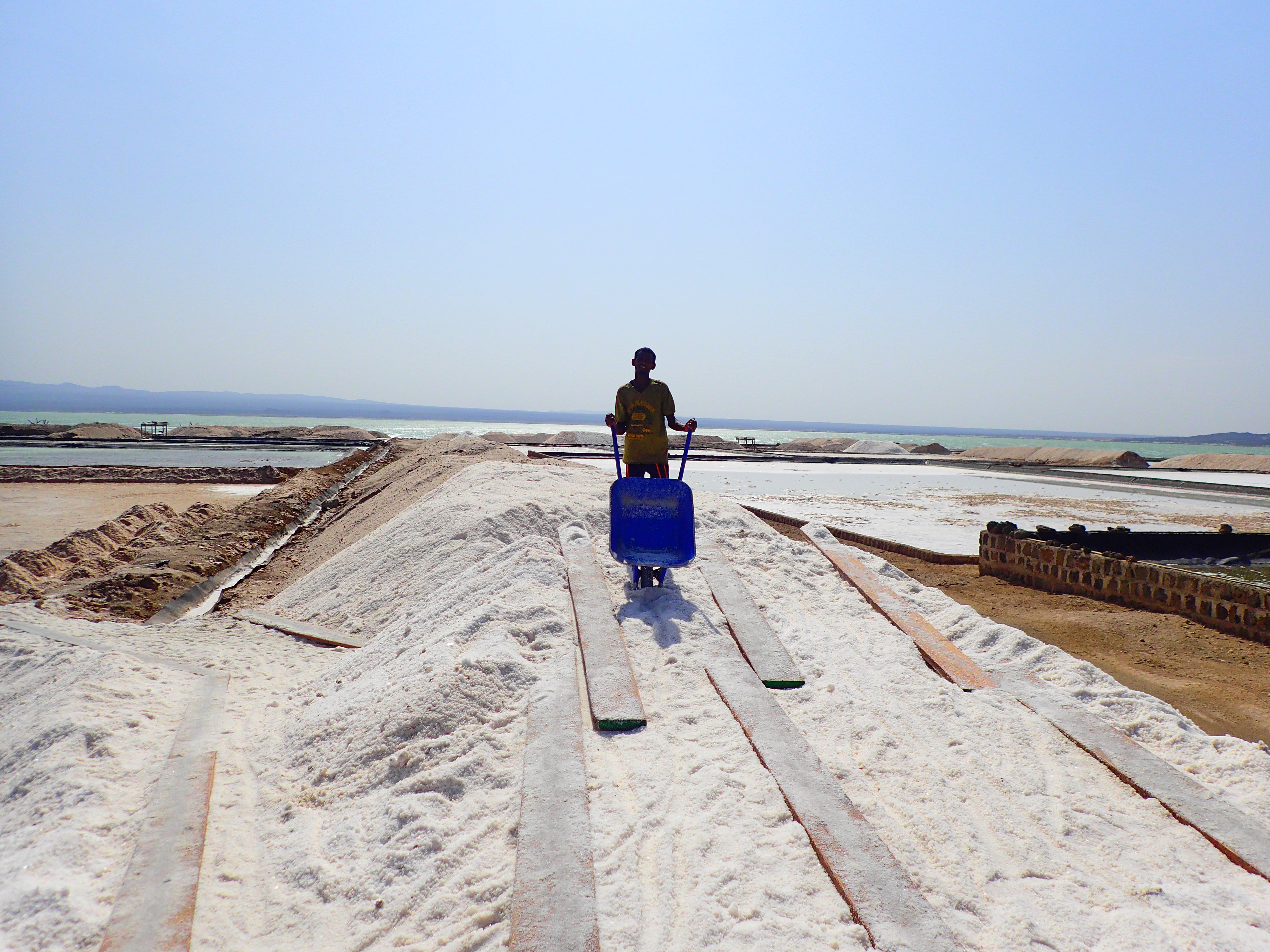 On a passé le premier jour sur la route pour se rapprocher du volcan, appelé Erta Ale, signifiant montagne fumante. Nous avons passé la nuit au bord du lac salé Afdera, situé dans la partie sud de la dépression Afar. Après une nuit ou la température a mis du temps à descendre sous les 35 degrés, nous sommes allées visiter les salines. En effet l eau salée du lac est pompée jusqu’à des bassins où l eau s evapore afin de récolter le sel. On reprend la route jusqu’au volcan en récupérant sur la route un groupe de 2 4×4.