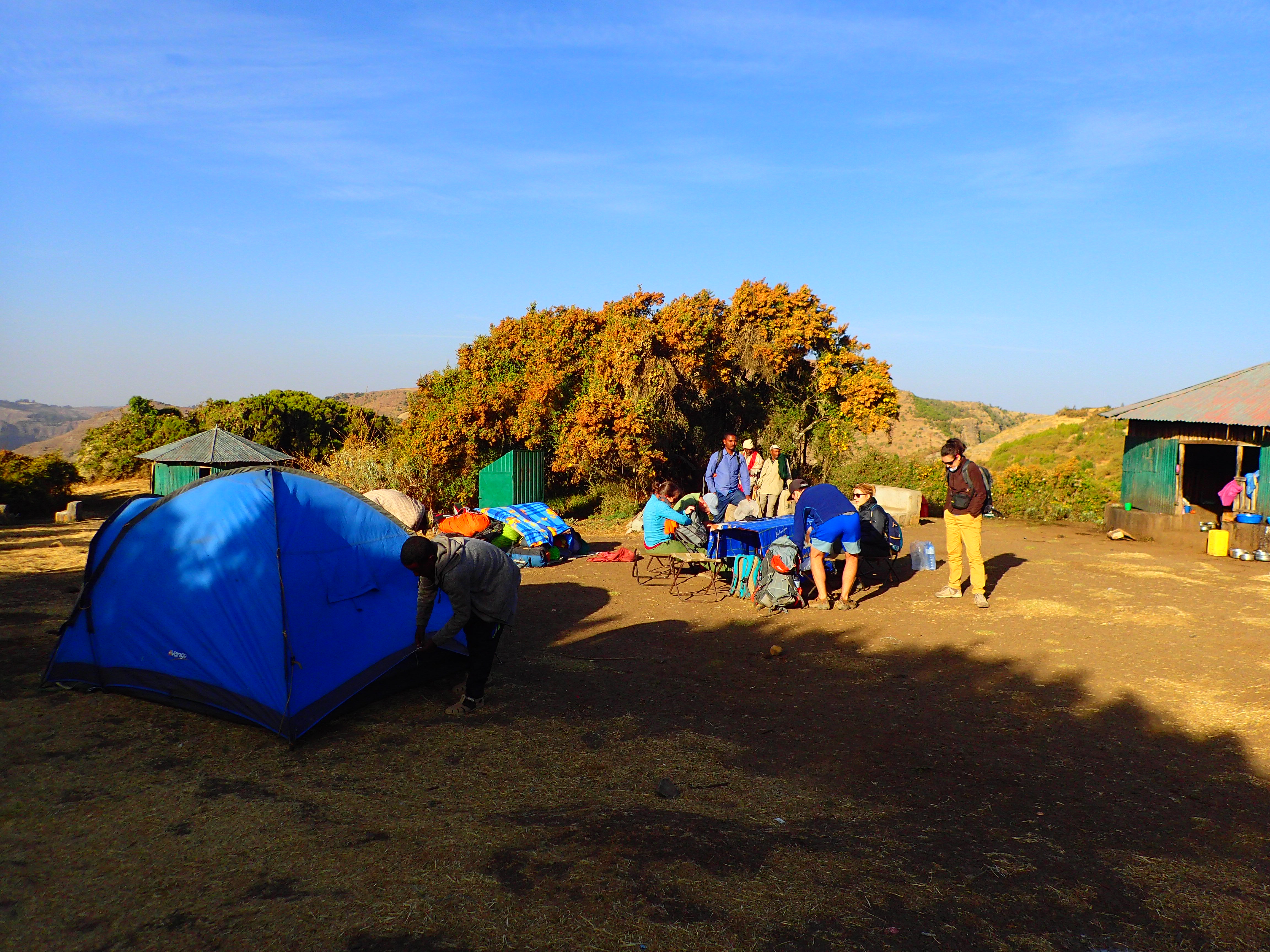 Une première nuit difficile sous la tente pour Rachel qui a cause de l altitude et de ses problèmes féminins, eu l occasion d aller admirer ce magnifique ciel deux fois dans la nuit par 5 degrés…Un petit déjeuner, et en route pour nos 15 kms (6heures de marche) pour atteindre notre second campement à Giche (3600 mètres). Belle randonnée sur les contre-forts du Simien, avec de nombreuses vues spectaculaires et un pique nique au bord de la rivière.