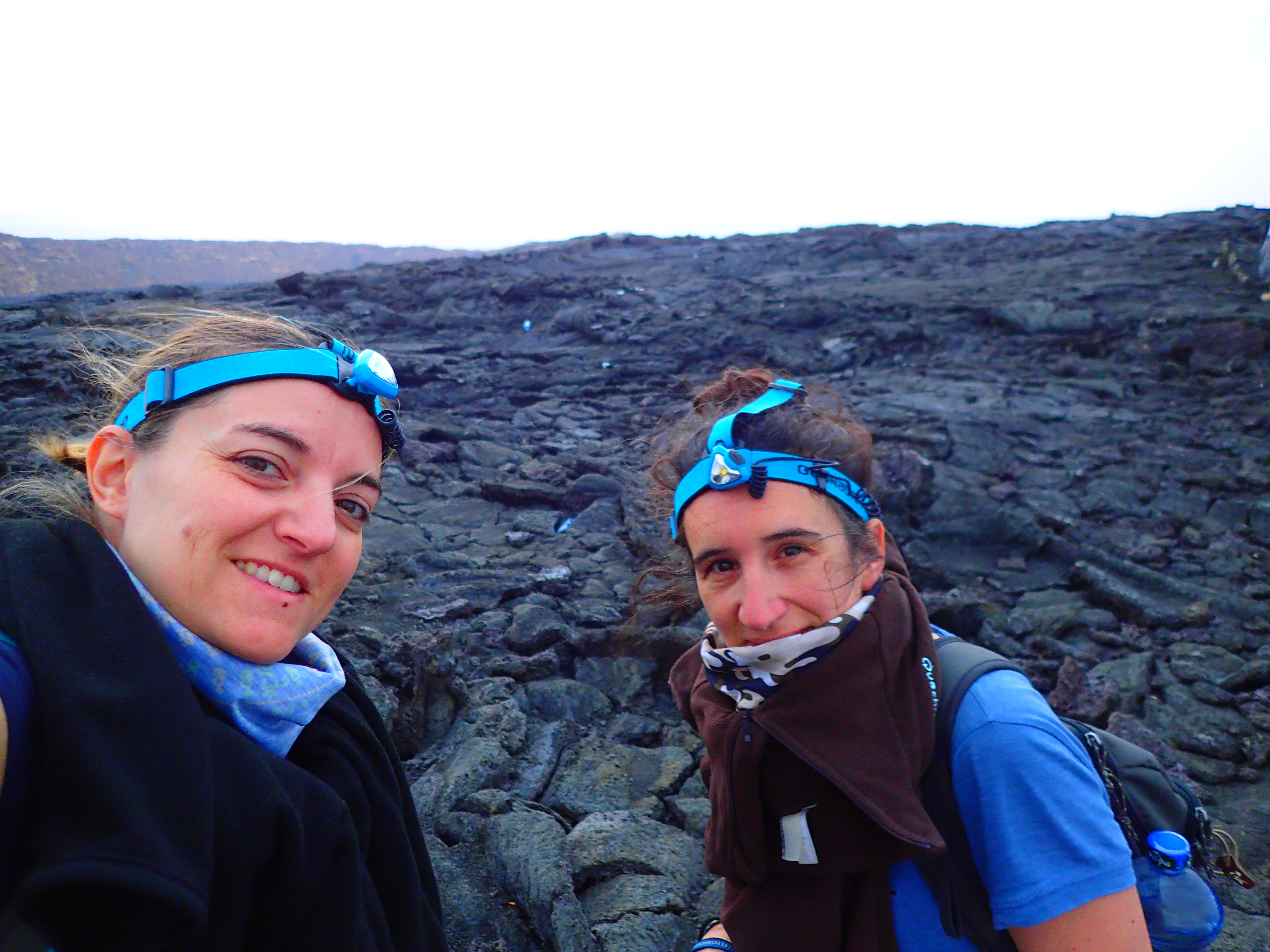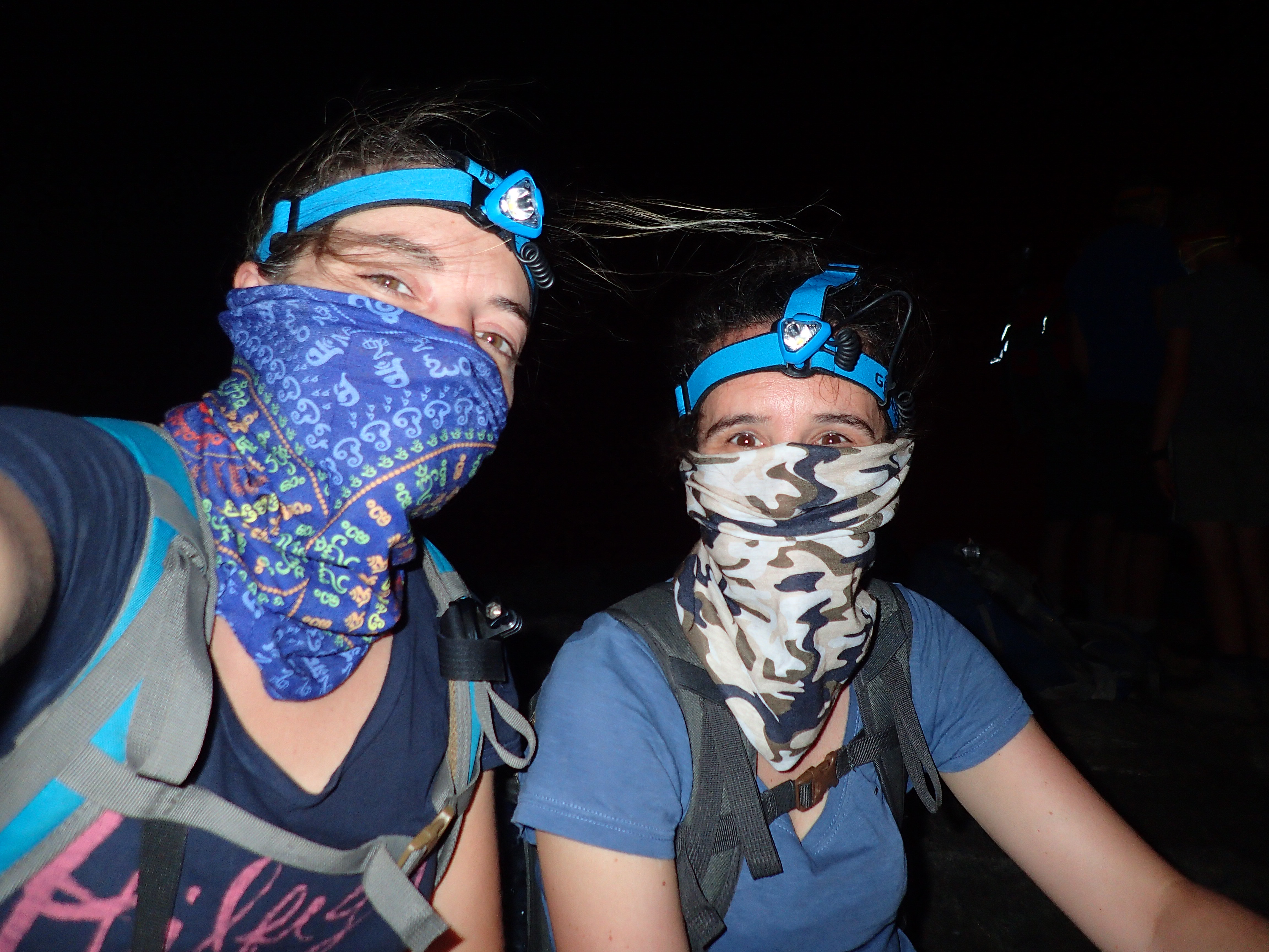 Après un dîner de bonne heure à 17h, ‘nous entamons le trek de 4h jusqu’au sommet du volcan. On commence 1h avant le coucher du soleil et nous terminons à la lampe frontale sous la nuit étoilée. Pour nous motiver, nous apercevons la fumée rougeoyante du volcan. En effet, ce volcan est actif, avec un large cratère volcanique rempli d un lac de lave fluide et rouge, en fusion a plus de 1200 degrés. On croise les doigts car la lave n est pas toujours visible à cause de la fumée. Arrivée au camp où nous allons passer la nuit, nous descendons prêt du cratère pour observer la lave. Il faut faire attention aux fumées toxique de souffre en se protégeant le visage. Beaucoup de fumée pour cette première approche,mais il est impressionnant d entendre le grondement de la lave en fusion. De temps en temps une bourrasque de vent dégage la fumée et nous permet d apercevoir la lave. Nous partons nous coucher à la belle étoile pour 4h de repos avant de retourner voir le volcan avant le lever du soleil.