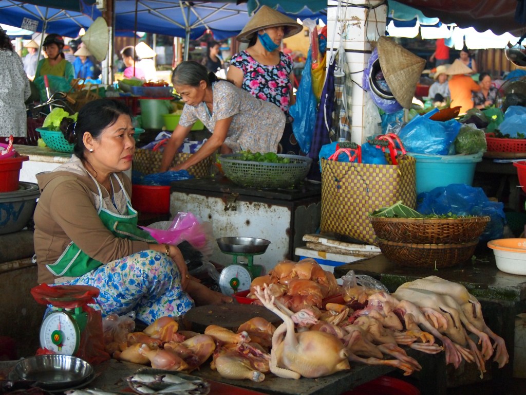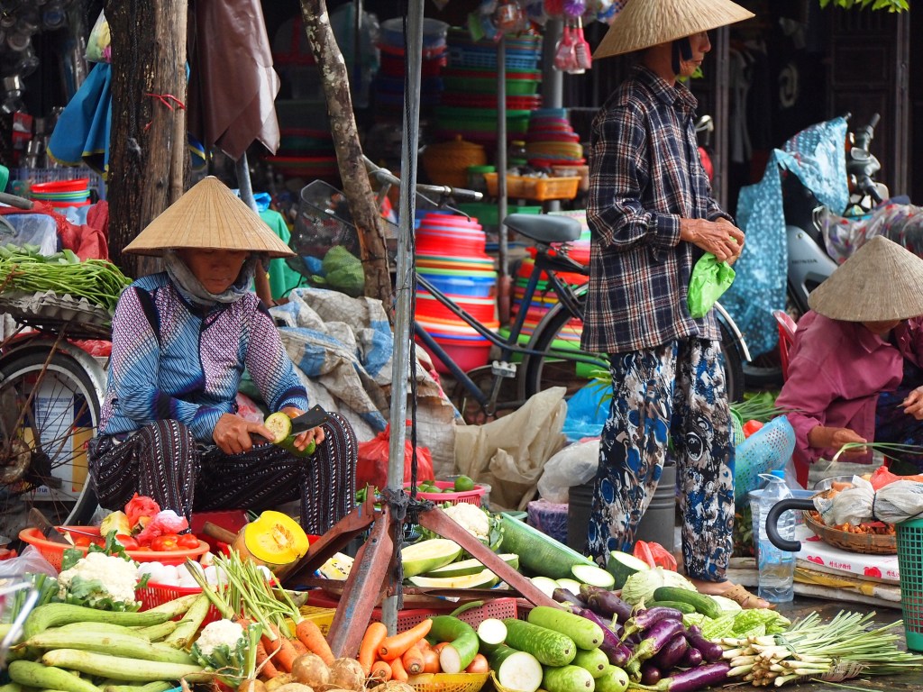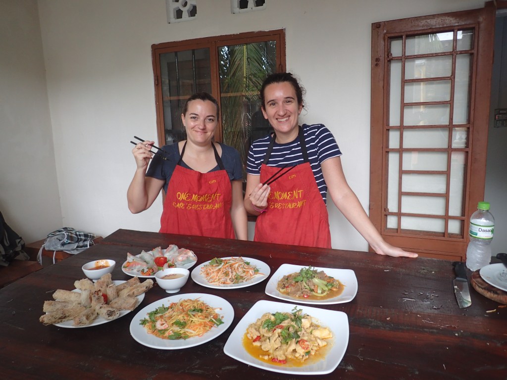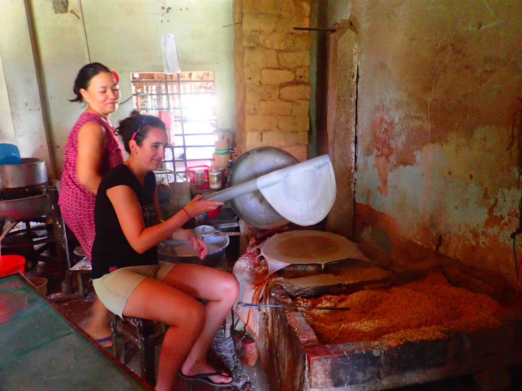 En attendant que le soleil revienne, nous avons pris un cours de cuisine. Nous sommes donc partis au marché pour acheter les ingrédients pour préparer une salade à la papaye, des rouleaux de printemps frais et un poulet à la citronnelle. Le ventre bien rempli, nous nous sommes reposées puis baladées dans la vielle ville de Hoï An